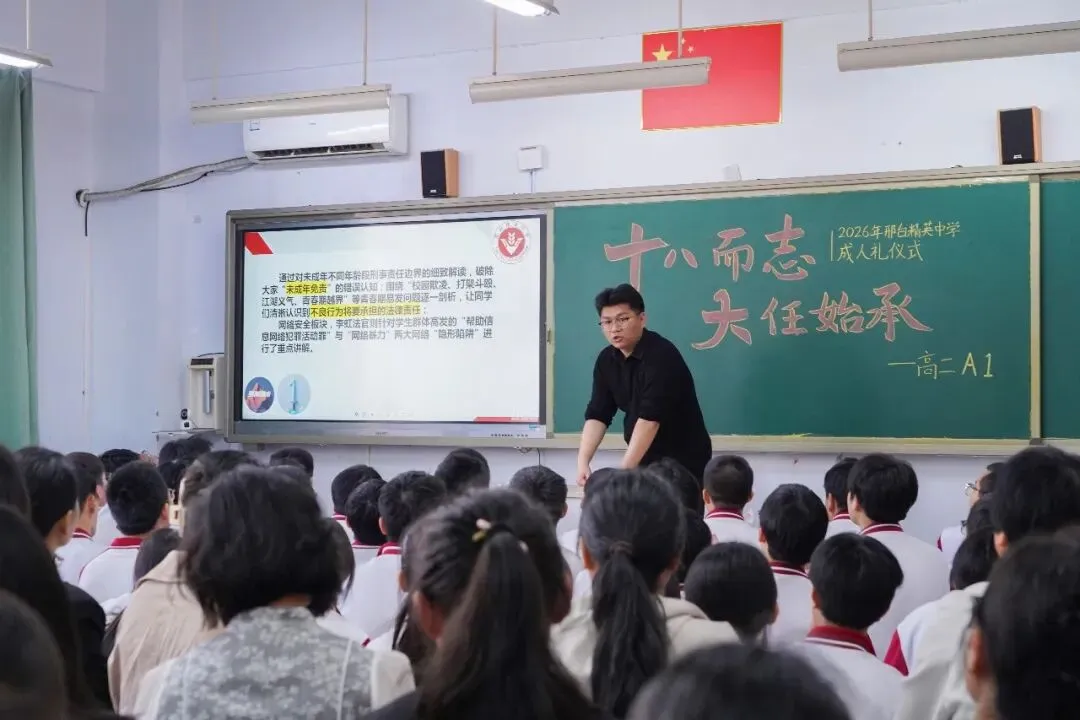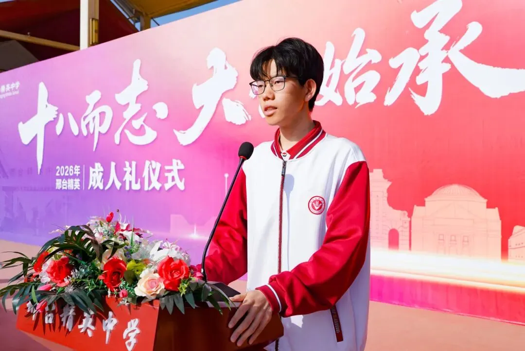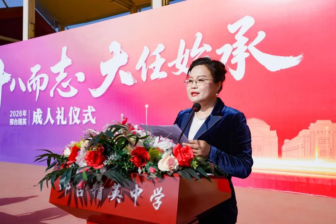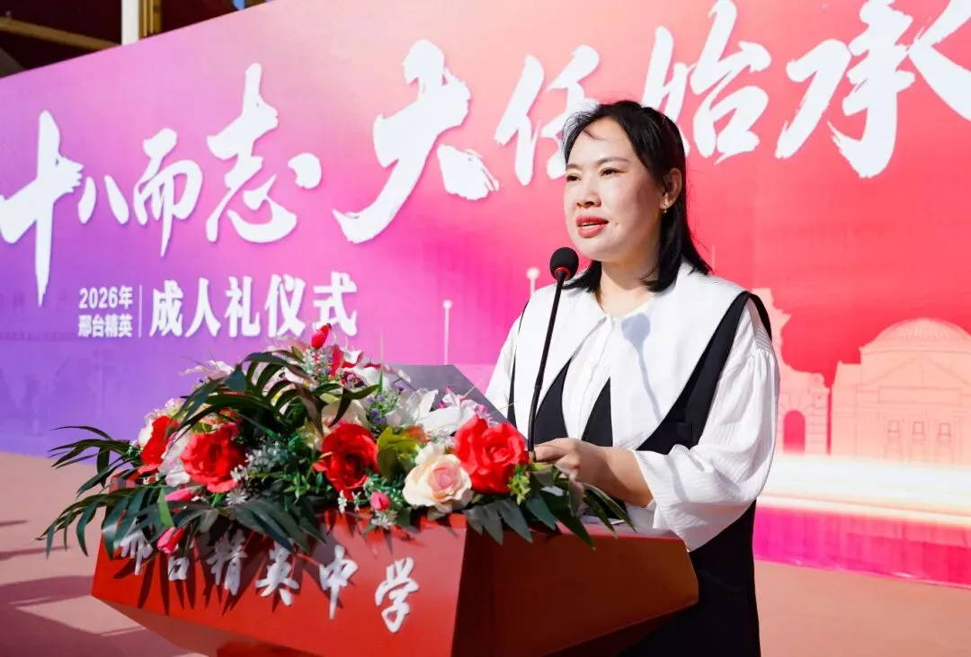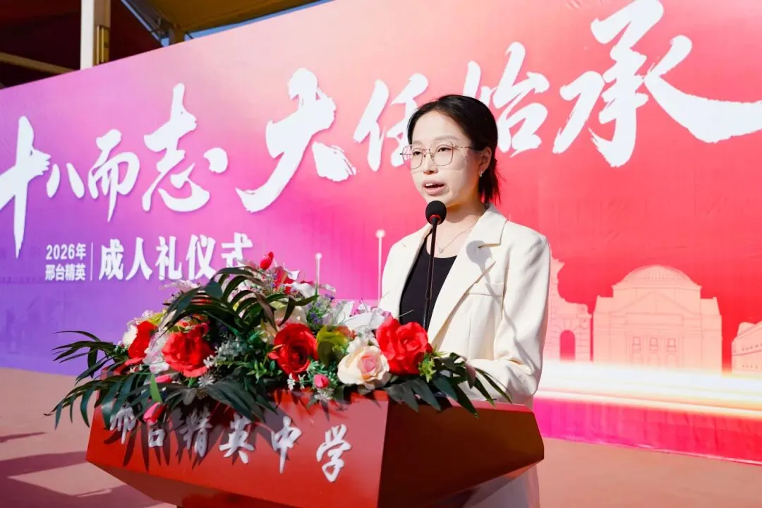 石家庄精英中学邢台校区副校长邵玉兰在致辞中,向步入成人行列的学子们致以热烈祝贺。她表示,十八岁是人生的全新序章,当以成年为新起点,立大志、明大德、成大才、担大任,以奋斗之姿追逐梦想,以责任之心奔赴山海,在担当中书写人生华章。话语饱含深情与期望,让学子们倍受鼓舞。