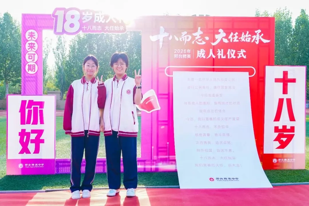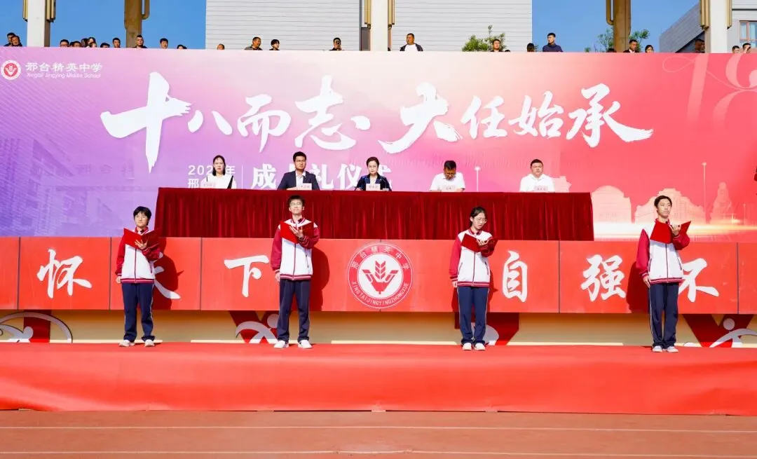 十八成人志远长,少年乘风迎骄阳。近日,石家庄精英中学邢台校区隆重举行“十八而志 大任始承”2024级成人礼。精英中学邢台校区副校长邵玉兰、高峰、王玉媚等校领导出席活动,与家长们共同见证这场青春的盛会。