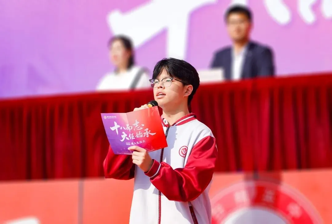 “少年智则国智,少年富则国富,少年强则国强……”学子挺膺而立,齐声朗诵《少年中国说》。铮铮誓言,回荡会场;铿锵字句,宣告着成年的信仰与担当,彰显着新时代青年的昂扬风貌。