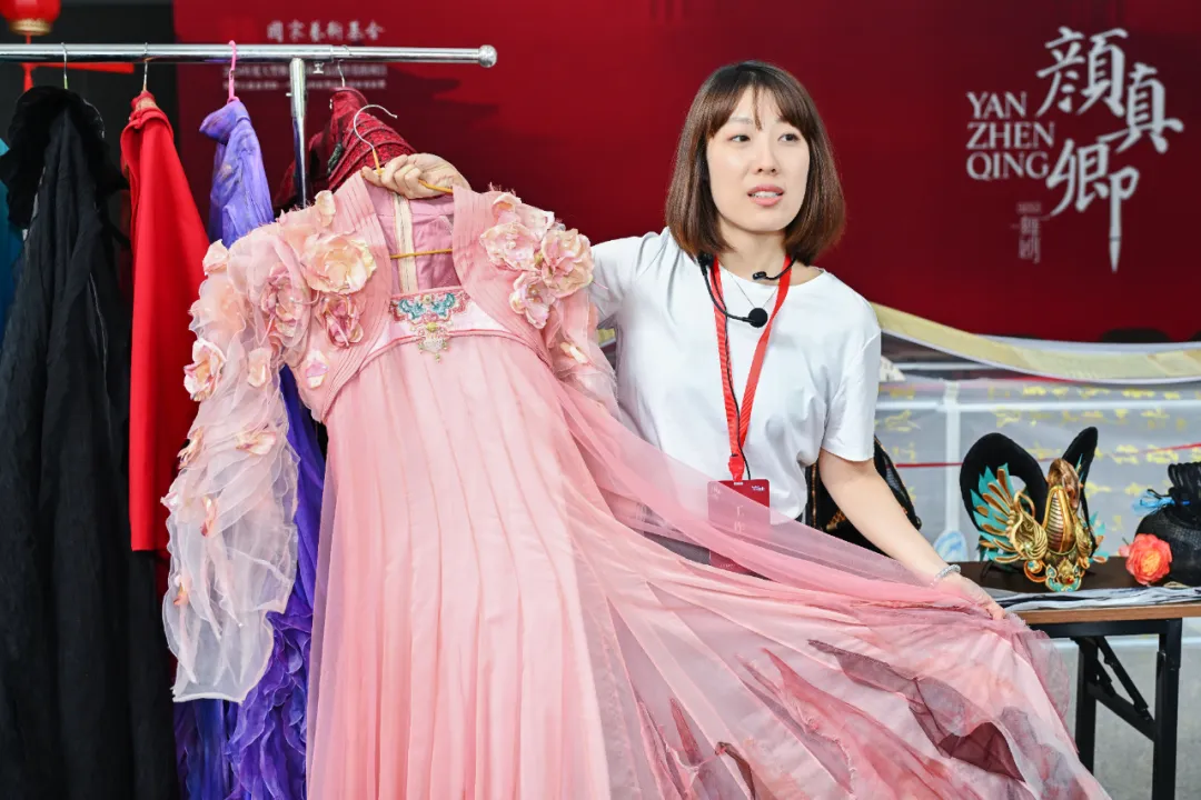 道具老师和服装老师早已准备就绪。每一件道具都沉淀着大唐的气息;精致的演出服依次排开,针脚之间仿佛能触摸到颜真卿一生的风骨。大家近距离观看、提问,甚至亲手触摸那些舞台上的“老伙计”。