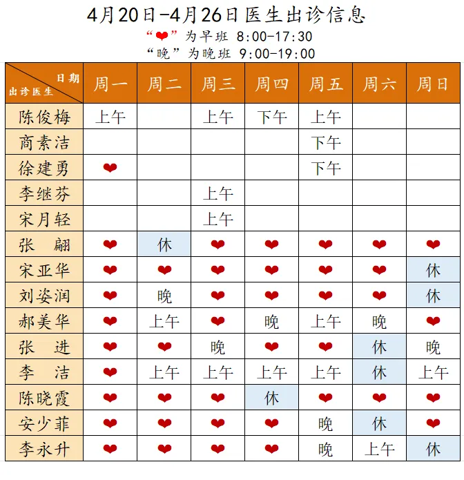 【出诊信息】4月20日-4月26日石家庄杏林中西医结合医院医生出诊表
