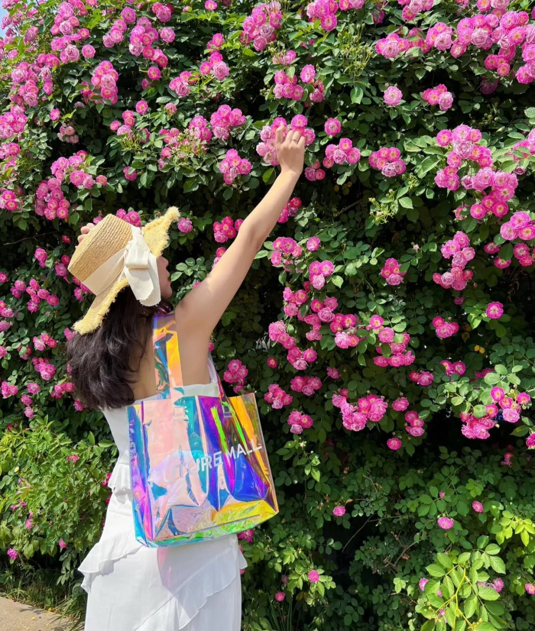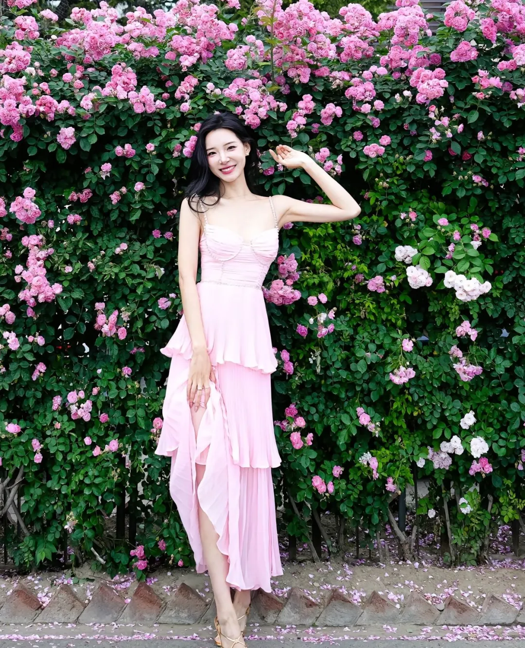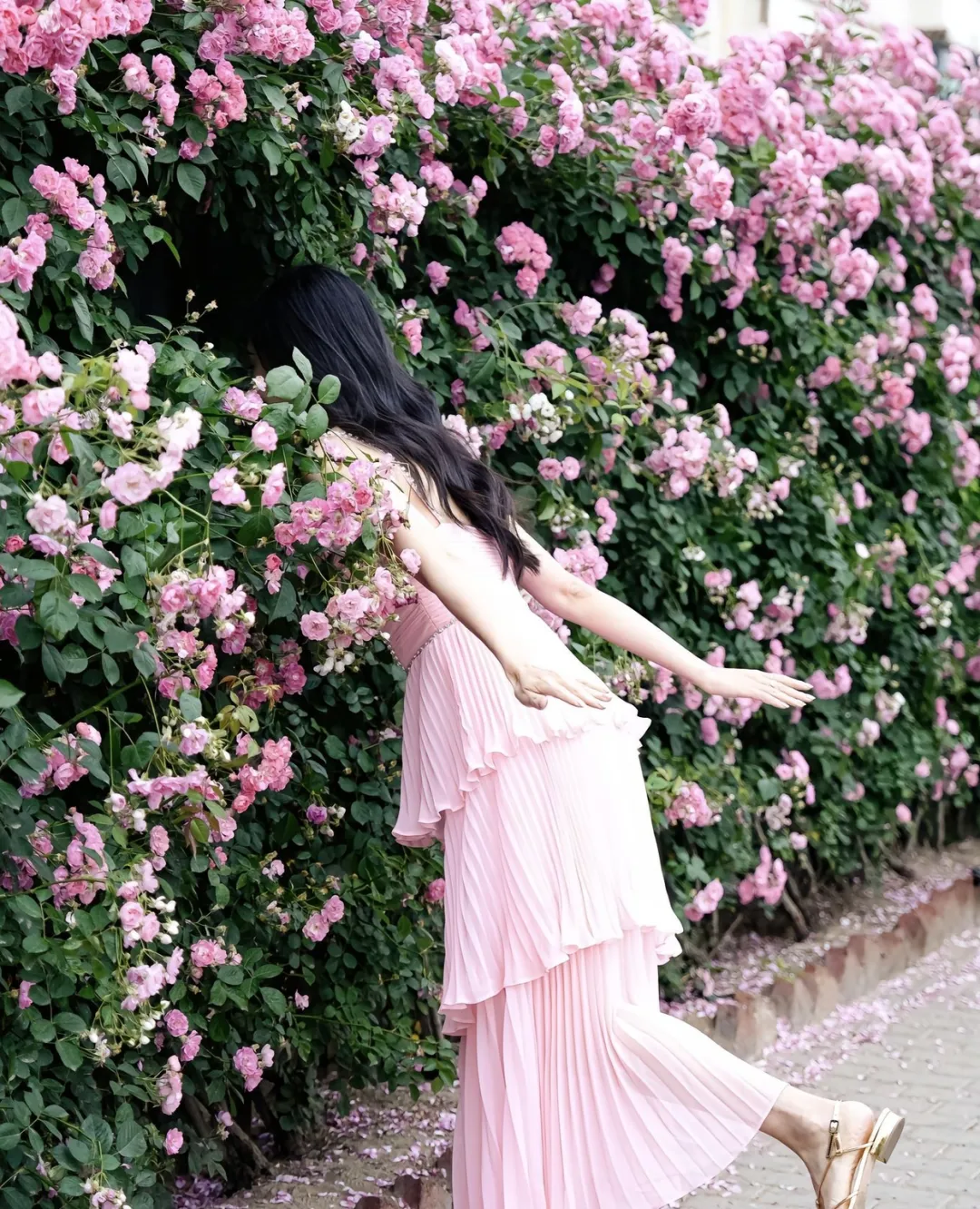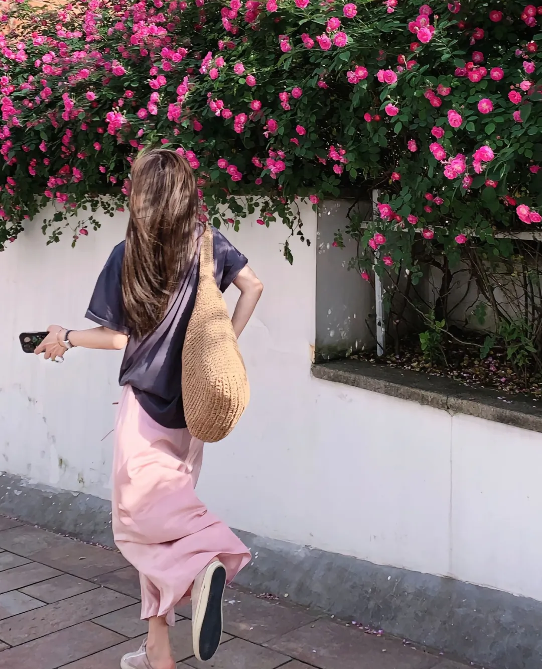 微风轻拂,蔷薇花随风摇曳,花瓣轻轻地飘落,如同一只只蝴蝶翩翩起舞。落英缤纷,地面铺上了一层花毯,行人小心翼翼地走过,生怕惊扰了这宁静的美好。在这花墙前,时间仿佛也放慢了脚步,人们沉浸在这花香中,忘却了尘世的喧嚣与烦恼。