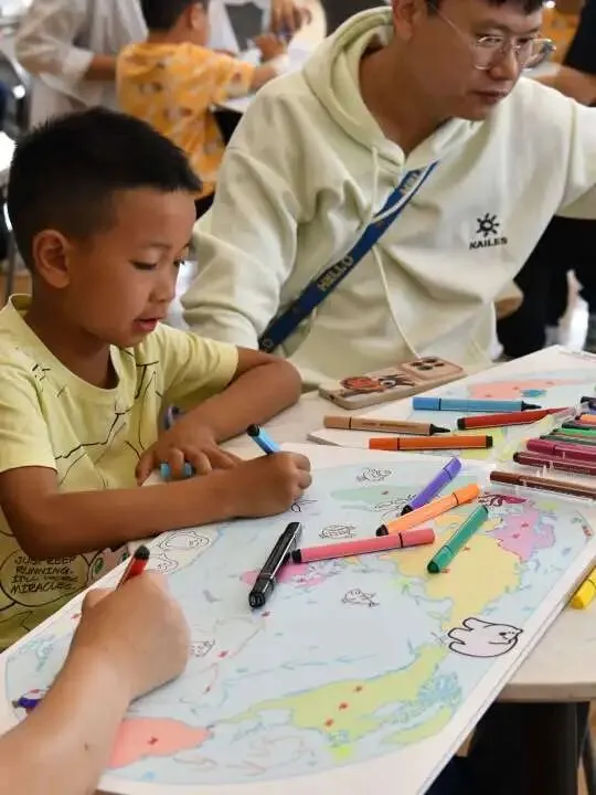 手工实践环节充满乐趣,大家在工作人员的指导下,充分发挥想象力与动手能力,用不同颜色的画笔标注了重点暖流和重点寒流,再画出小鱼剪下来贴在四大渔场位置并标注渔场名称,家长们也主动参与,亲子协作、温馨互动,一件件充满童趣的作品,定格了美好时光。