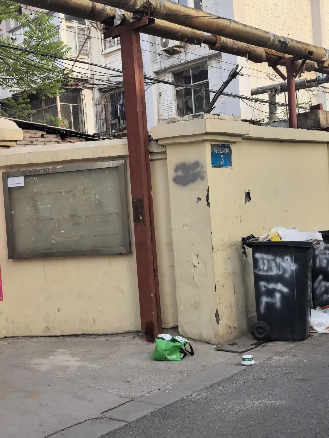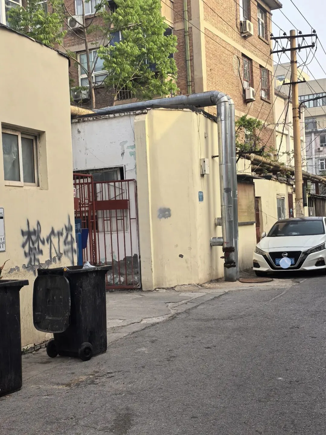 傍晚时分,下班的汽车缓缓驶过胡同,车轮碾过路面的声响,和老人们坐在门口摇着蒲扇聊天的声音混在一起。墙根下的垃圾桶换了新的,却依旧守着胡同的入口,像沉默的看客,看着孩子们骑着滑板车掠过,看着年轻人拿着相机拍下老管道和老墙,看着夕阳把胡同的影子拉得很长很长。