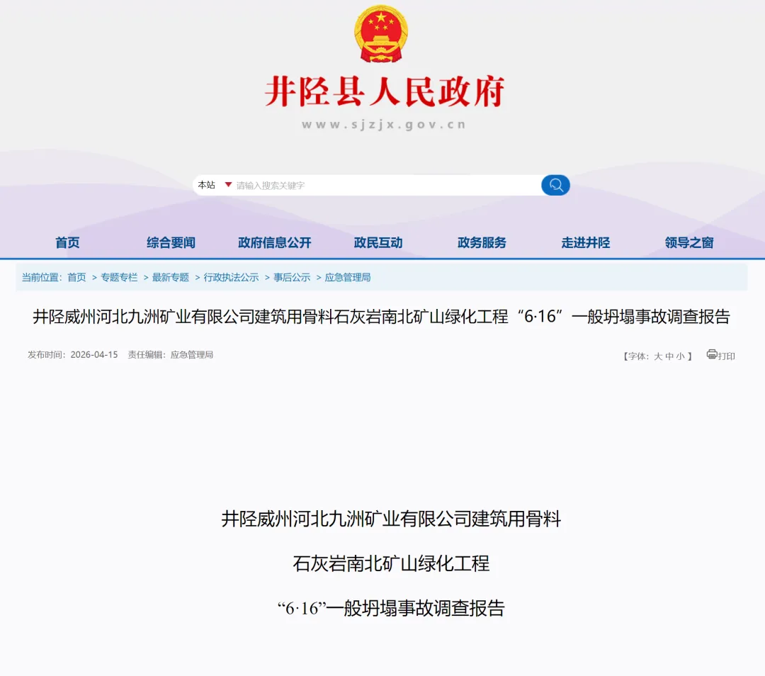 2026年4月15日,河北石家庄市井陉县应急管理局发布《井陉威州河北九洲矿业有限公司建筑用骨料石灰岩南北矿山绿化工程“6·16”一般坍塌事故调查报告》。