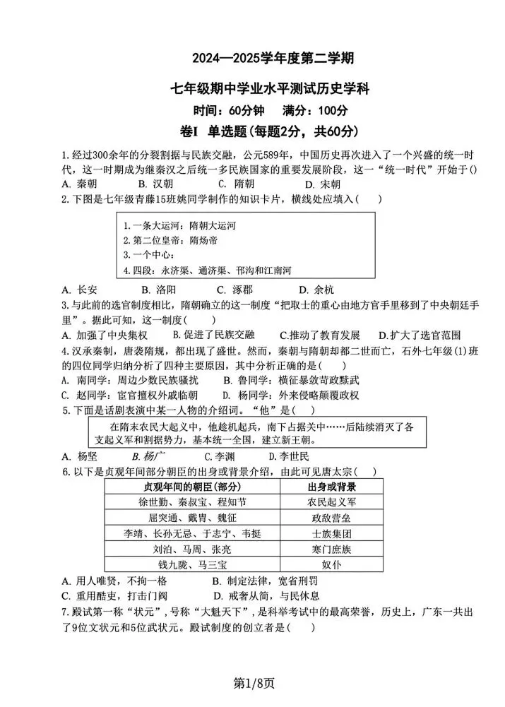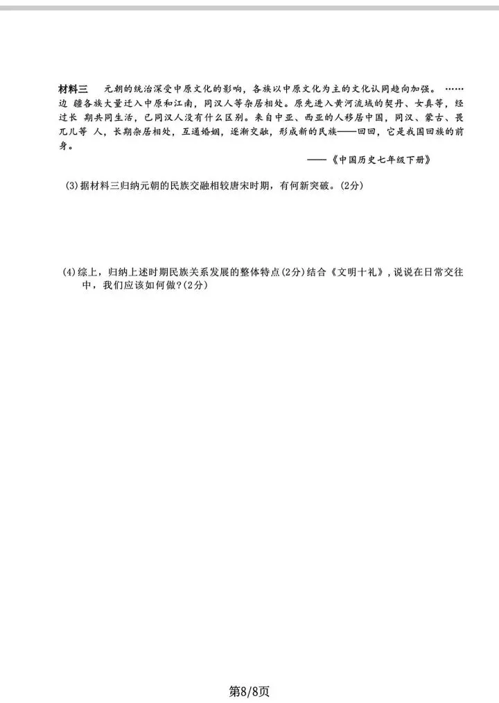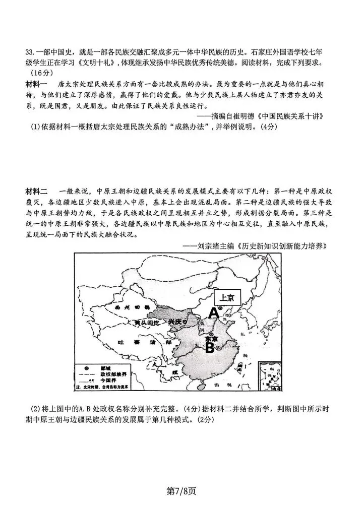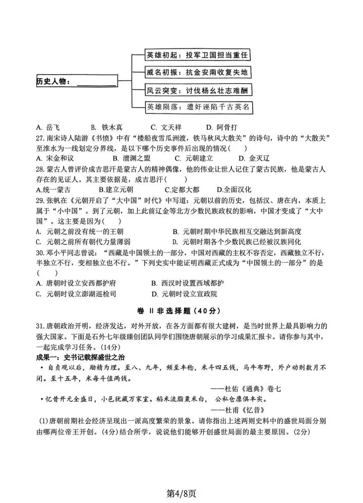 石家庄43中七年级下册期中历史卷