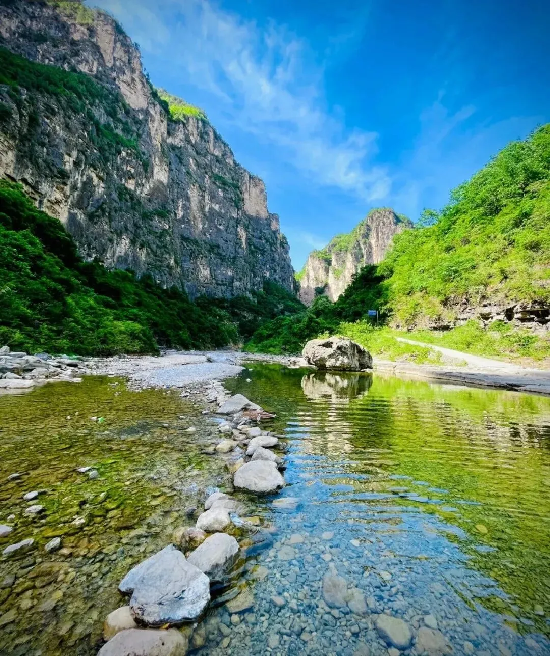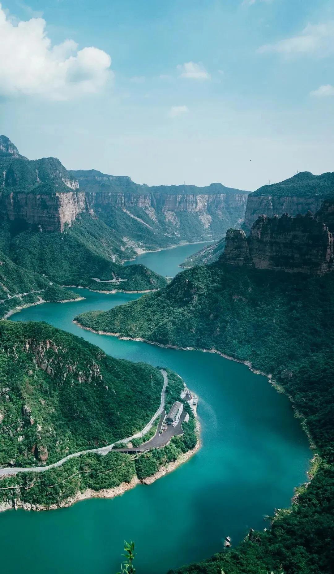 开车到半山腰的观景平台(路边有空地即可停车),脚下就是宝泉游龙湾——碧绿的河水呈“S”形蜿蜒在峡谷中,像一条游动的龙。《国家地理》曾认证这里是“中国最美峡谷”之一,免费看,不花一分钱!第二站:武家湾 · 太行山下的“小江南”