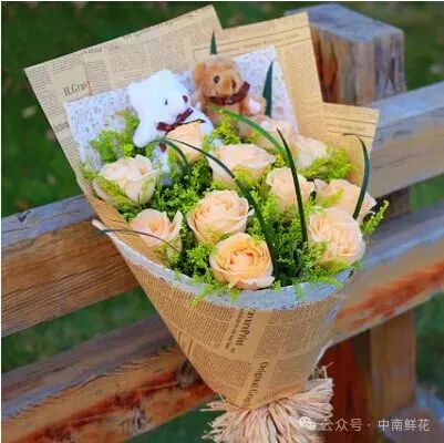 花材:11朵香槟玫瑰,绿叶间插,两个小熊