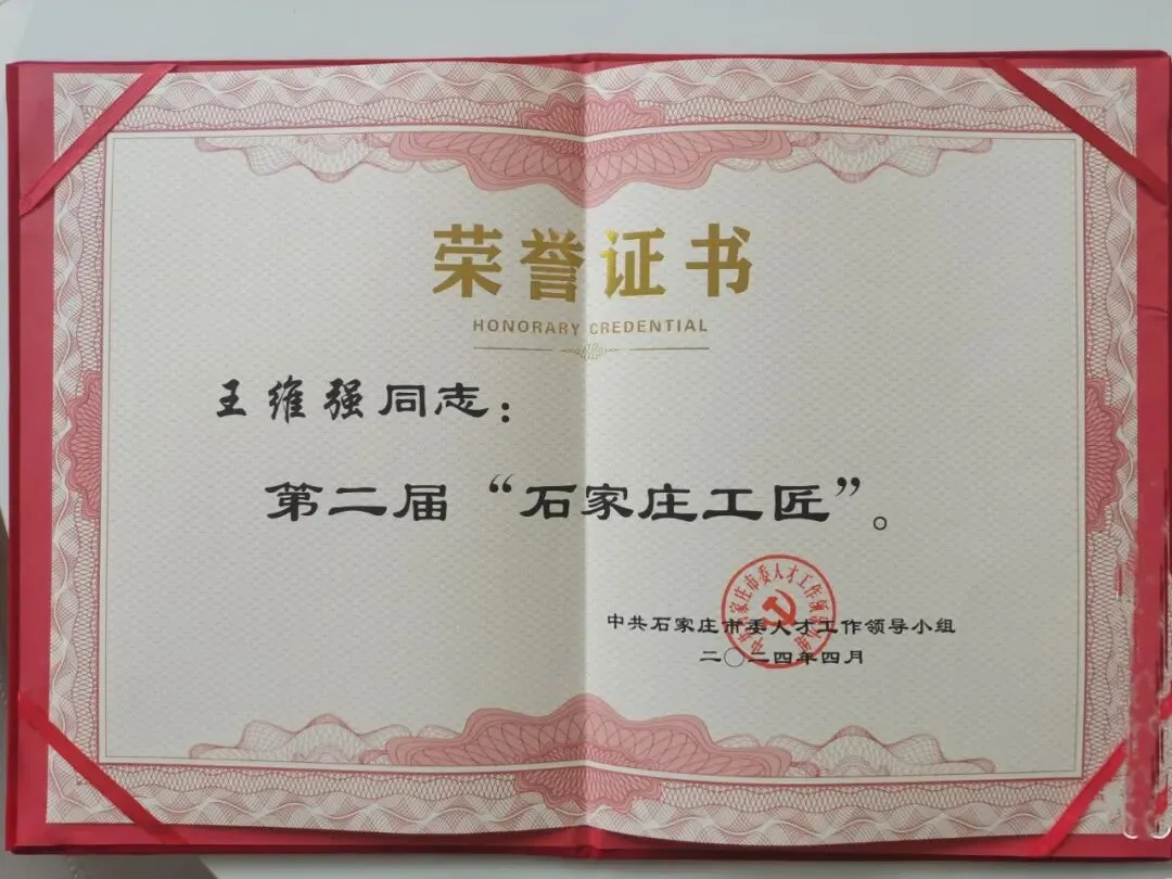 7月4日,中共石家庄市委人才工作小组颁发了“石家庄工匠”荣誉证书。