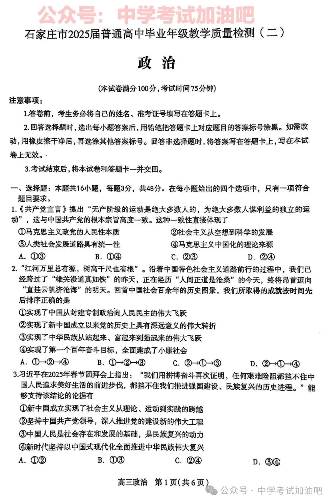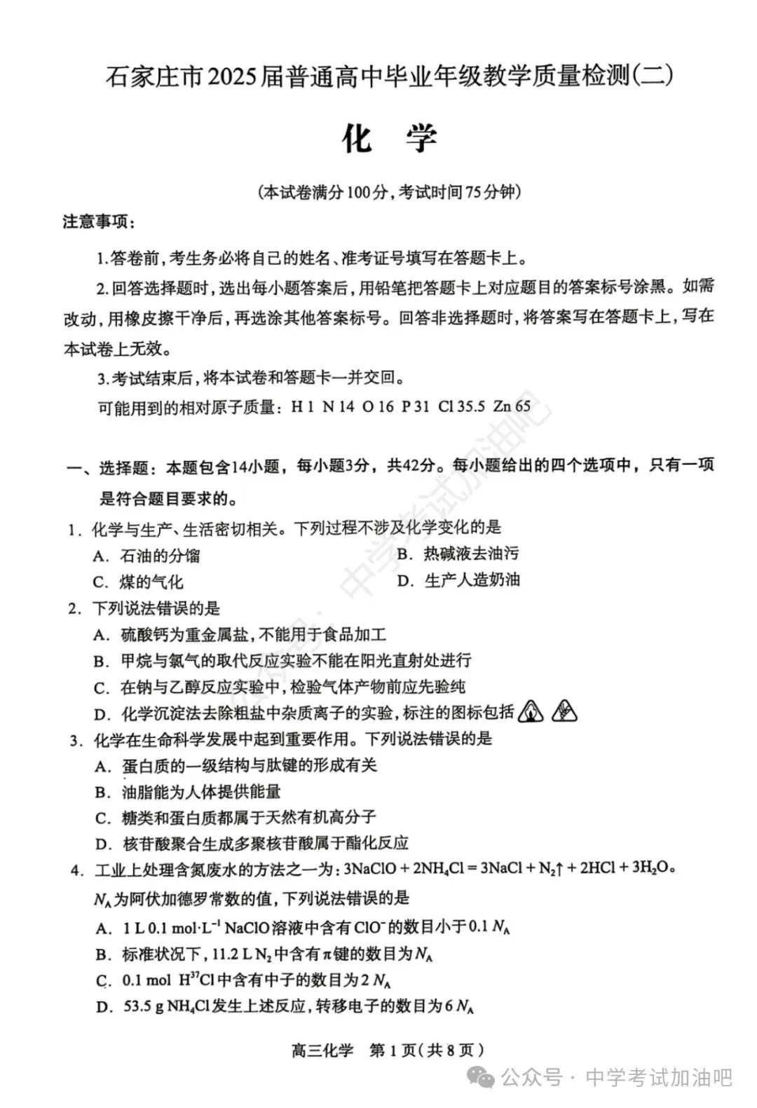 2025年4月石家庄市高三质检二英语物理历史真题及答案
