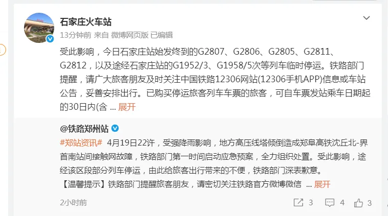 受此影响,4月20日途经石家庄站 G2807、G2806、G2805、G2811、 G2812、G1952/3、G1958/5次列车临时停运。