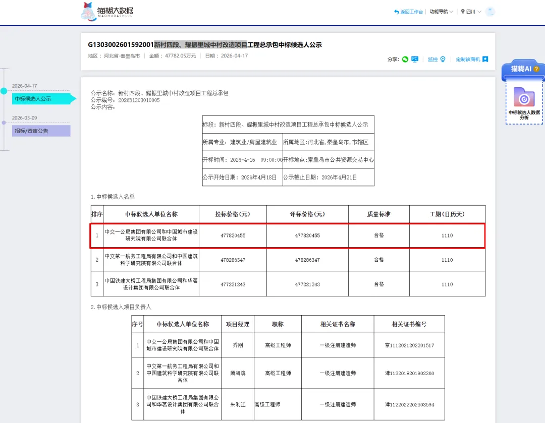 该项目于4月16日正式开标,共有6家投标人参与投标。最终由中交一公局集团有限公司、中国城市建设研究院有限公司联合体以4.7782亿元成功中标。计划总工期为1110日历天,其中设计周期为45日历天,施工工期为1065日历天,计划开工日期为2026年5月1日,计划竣工日期为2029年5月4日。