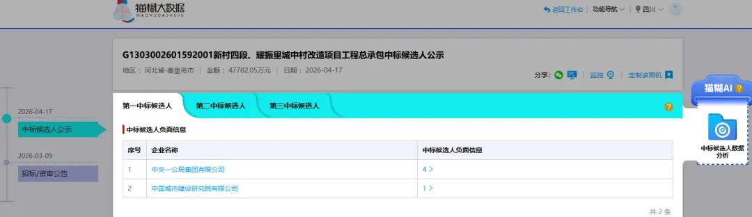 如果您希望获取关于中标候选人对于该项目的负面信息,可点击右侧的“中标候选人数据分析”。该功能运用智能检索技术,初步筛查中标候选人的相关信息,旨在帮助客户做出更明智的决策。检索范围包括中标候选人的负面信息以及项目负责人在建情况等。