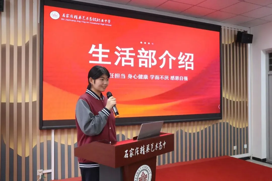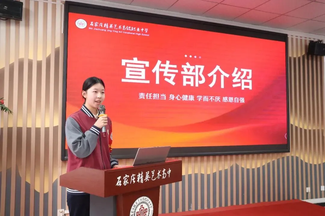最后,宣传部部长上台发言。她表示,宣传部是校园文化的窗口,是学校声音的传递者,部门成员由热爱文字、擅长摄影、乐于创作的文艺学子组成,主要负责校园新闻报道、板报策划评分、活动摄影摄像、校园广播设备操作等宣传工作,记录校园生活的精彩瞬间,传递校园正能量,展现精英艺高学子的青春风貌,增强校园文化凝聚力。