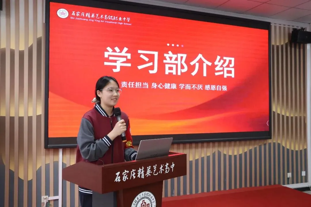学习部部长向大家分享了部门工作情况。她表示,学习部是助力同学们学业进步的重要平台,部门成员始终秉持“勤学笃行,互助共进”的宗旨,主要负责早读、自习课的检查工作,督促大家端正学习态度,专注学习。她希望通过学习部的工作,带动全体同学养成勤学、善思、富有激情的良好学风,助力大家在专业学习与文化学习中齐头并进。