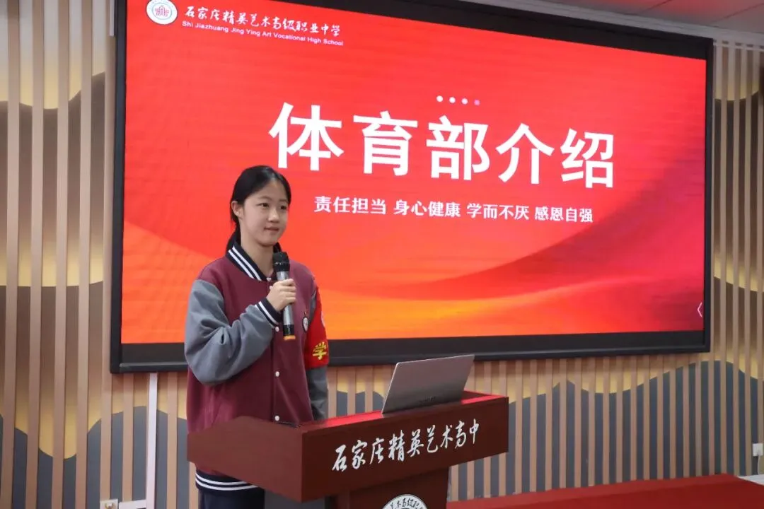 随后,体育部部长进行发言。她介绍,体育部作为校园体育文化的传播者,成员均由热爱体育、责任心强的学生组成,核心职责是落实两操检查工作、协助组织开展各类校园体育赛事,丰富同学们的课余生活,增强同学们的身体素质,培养大家的团队协作意识,营造积极向上、活力满满的校园体育氛围,同时协助学校做好体育活动的组织与秩序维护工作。