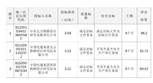 - 第一中标候选人为中水北方勘测设计研究有限责任公司,投标单价:3.08元/W!