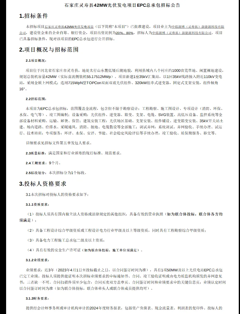 近日,石家庄灵寿县42MW光伏发电项目EPC总承包项目中标候选人公示,其中: