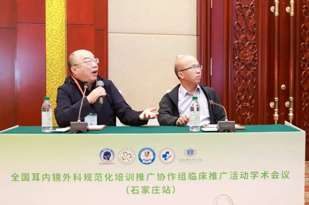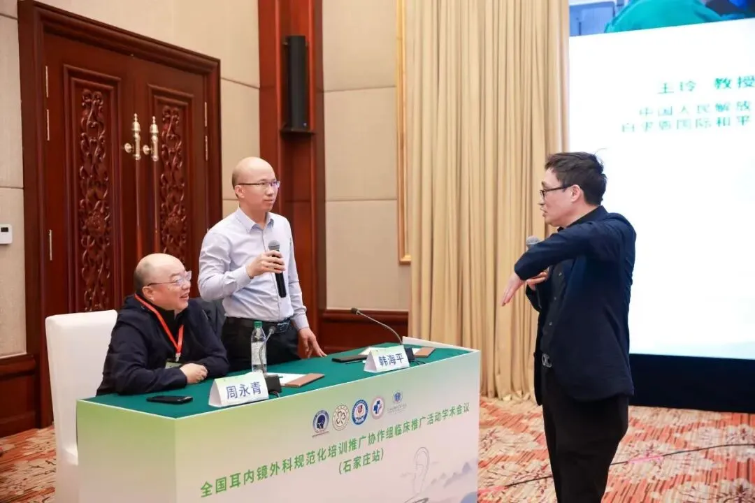 特邀讨论专家与本地讨论专家,围绕手术技巧与培训体系建设展开了深入对话。河北医科大学第一医院申宇鹏教授着重分享了医院在耳内镜微创技术推广中的实践经验。