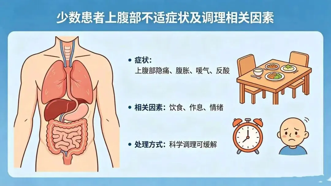 临床中,约半数患者无明显症状,仅在常规胃镜检查时偶然发现;少数患者会出现上腹部隐痛、腹胀、嗳气、反酸等不适,多与饮食、作息、情绪等因素相关,通过科学调理即可缓解。