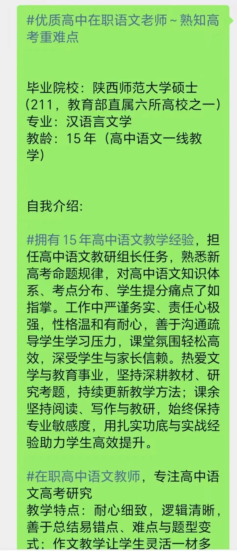 毕业院校:陕西师范大学硕士(211,教育部直属六所高校之一)专业:汉语言文学教龄:15年(高中语文一线教学)