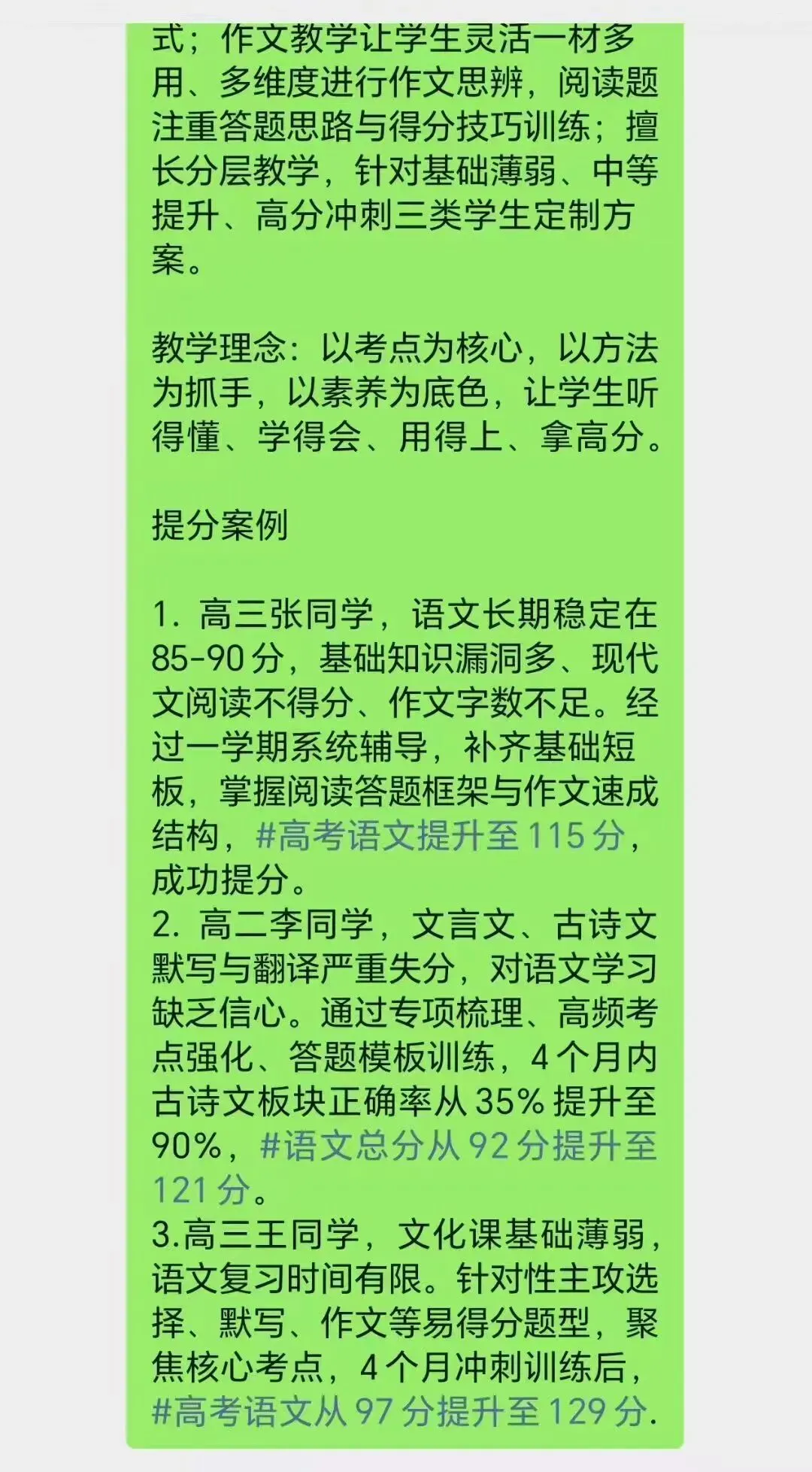 #拥有15年高中语文教学经验,担任高中语文教研组长任务,熟悉新高考命题规律,对高中语文知识体系、考点分布、学生提分痛点了如指掌。工作中严谨务实、责任心极强,性格温和有耐心,善于沟通疏导学生学习压力,课堂氛围轻松高效,深受学生与家长信赖。热爱文学与教育事业,坚持深耕教材、研究考题,持续更新教学方法;课余坚持阅读、写作与教研,始终保持专业敏感度,用扎实功底与实战经验助力学生高效提升。