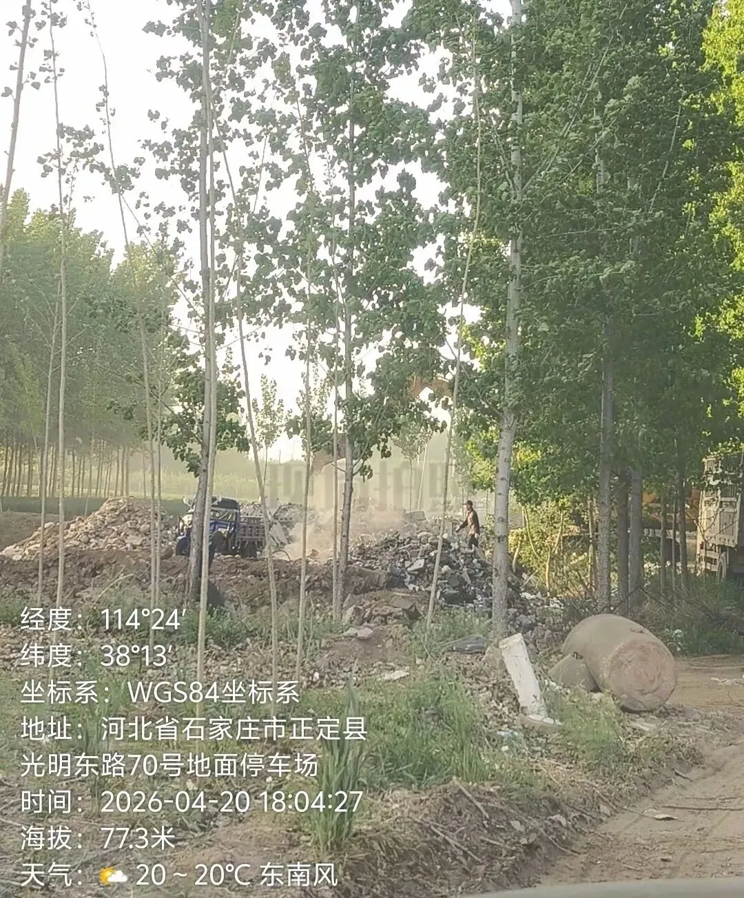 近日,据群众现场拍摄反映,正定县光明东路附近(光明东路70号地面停车场周边区域)存在违规倾倒、非法填埋建筑垃圾的行为。现场有大型货车运输建筑垃圾,挖掘机正在对垃圾进行就地填埋作业,无任何防渗、抑尘及环保防护措施,建筑垃圾直接裸露堆放并填埋于林地旁的空地上。