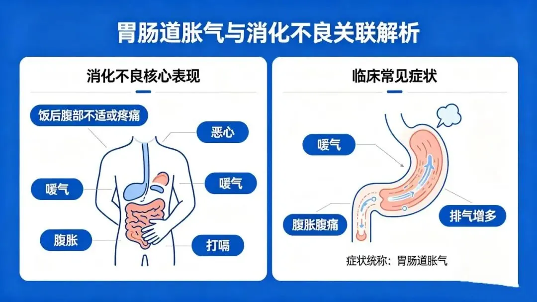 胃肠道胀气是消化不良引发的一系列症状统称,消化不良多表现为饭后腹部不适或疼痛,常伴随恶心、嗳气、腹胀、打嗝等。临床常见症状主要为嗳气、腹胀腹痛及排气增多。