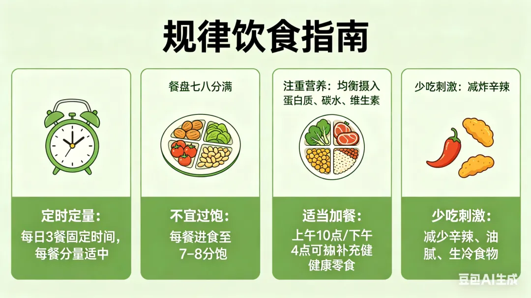 再忙也要好好吃饭,做到定时定量、不暴饮暴食。除三餐外,上下午可适当加餐,每餐不宜过饱。多吃营养均衡的食物,少吃辛辣刺激等刺激性食物。