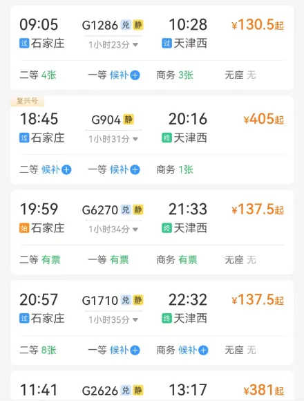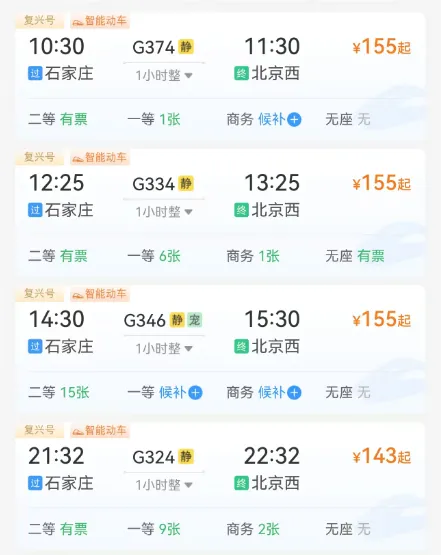 🚅高铁车次及票价参考: