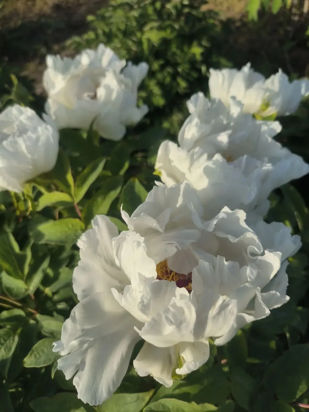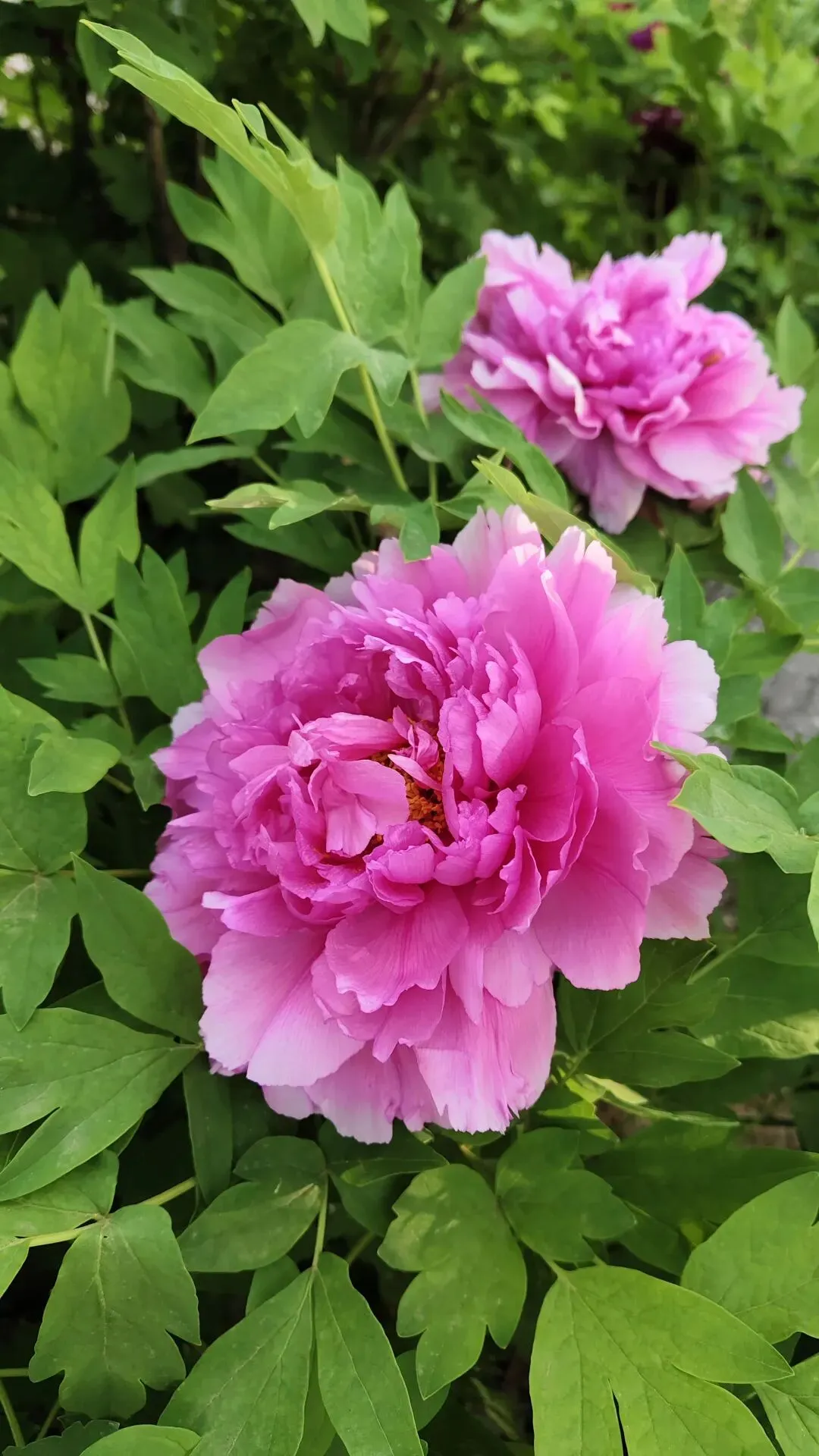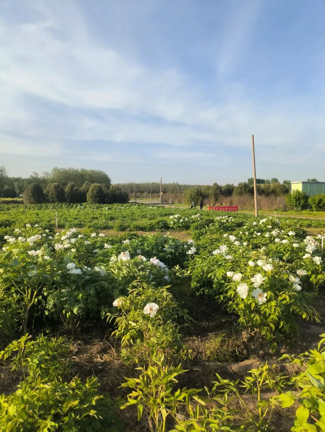 说回这里的牡丹,这里纯白色挺多。粉色和玫红比较少,也可能还没全开吧。打眼一看,白白的一片。近了看,花瓣层数没别处的多,也没各种园里精致,叶子多,花还少,这些花吧,还喜欢藏在叶子里,好像怕人看见一样。