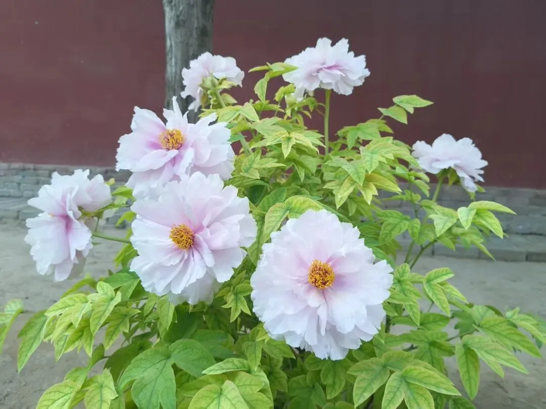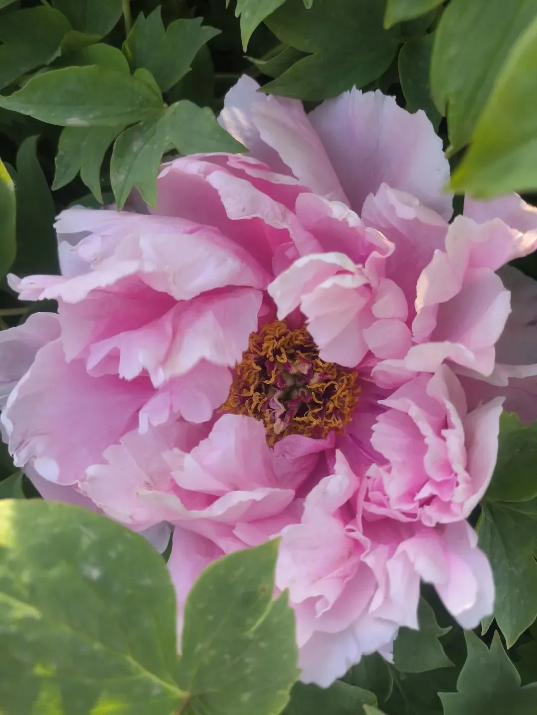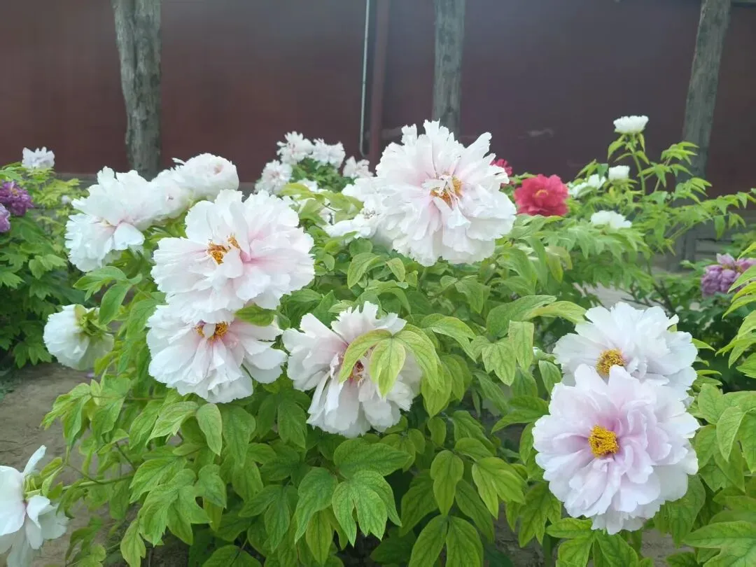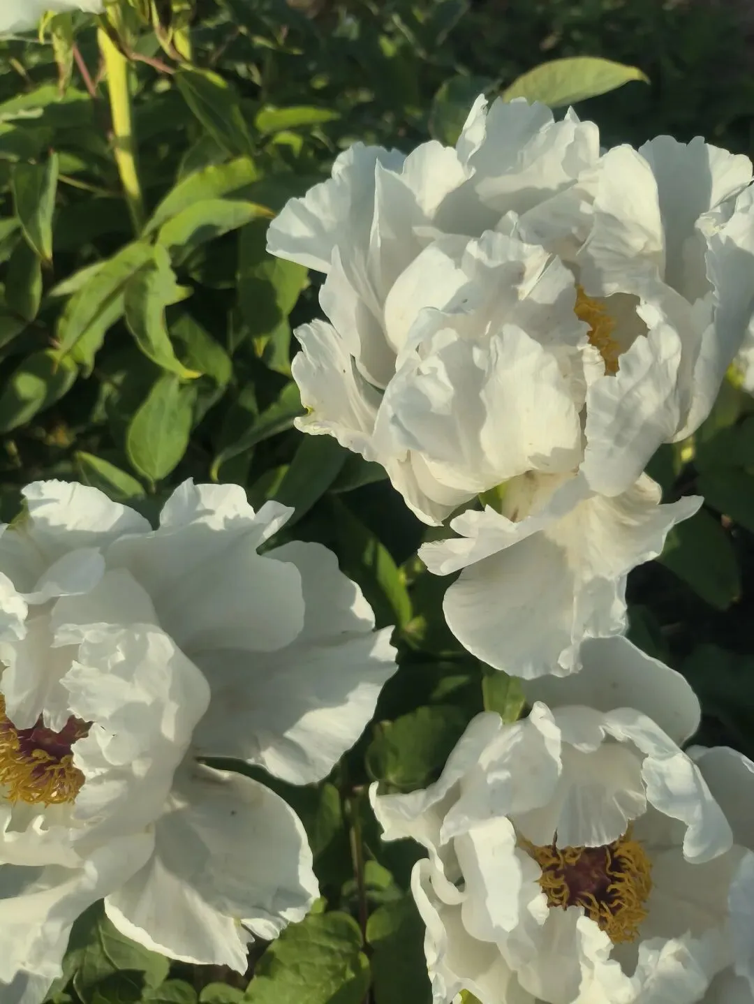 说回这里的牡丹,这里纯白色挺多。粉色和玫红比较少,也可能还没全开吧。打眼一看,白白的一片。近了看,花瓣层数没别处的多,也没各种园里精致,叶子多,花还少,这些花吧,还喜欢藏在叶子里,好像怕人看见一样。
