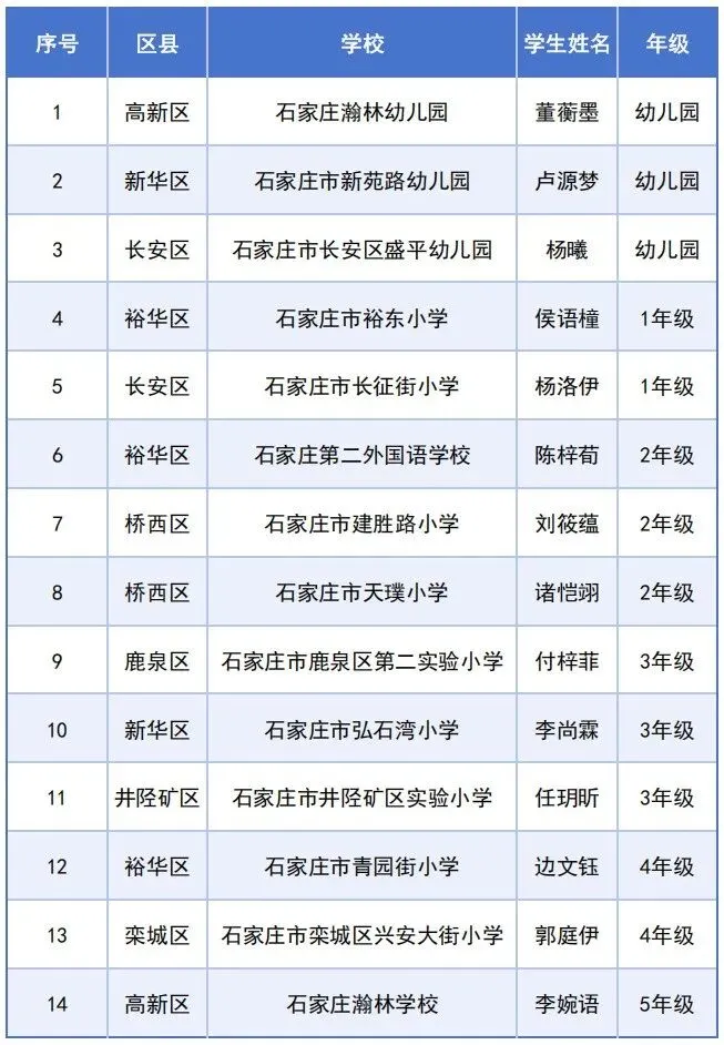 根据《关于举办第四届石家庄市少年儿童“航空航天科普小使者”评选展示活动的通知》要求,秉承公平、公正、公开的原则,依照活动规则、评审标准及评奖要求,经评审,现将“航空航天科普小使者”名单予以公示。