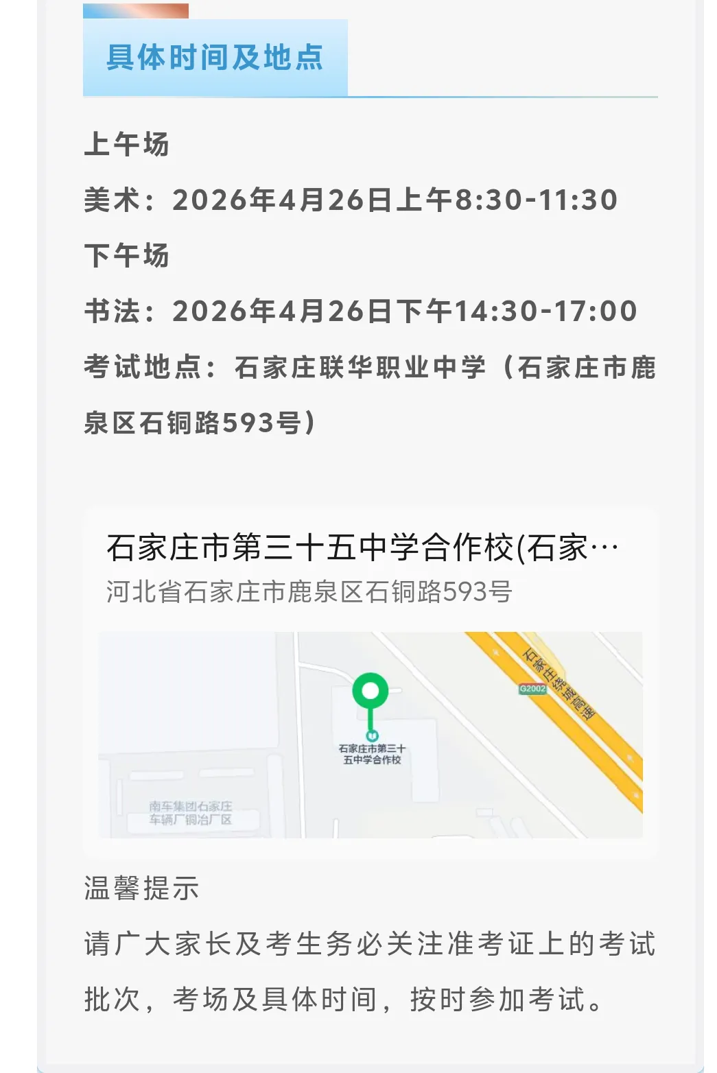 35中和45中是很多美术考生的意向学校,每年校考都会吸引数千学生报名,这意味着这些考生要在周日上午先去联华中学参加考试,然后在中午考试结束后立刻赶往立美中专,参加下午45中这边的校测。横跨距离非常大,联华位于石家庄西南方向,在鹿泉区石铜路上,而立美则位于石家庄东北方向,在长安区西兆通,空间跨度非常大。两天连续三场考试,一直奔波在考试路上,这对学生的精力和承受力都是一个极大的考验。