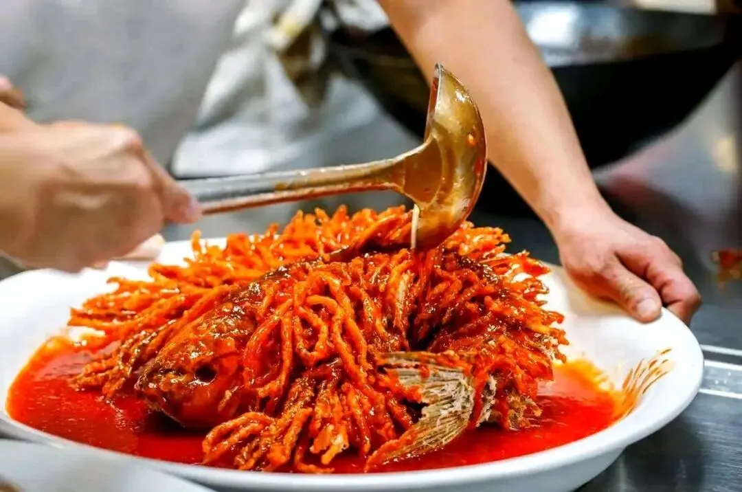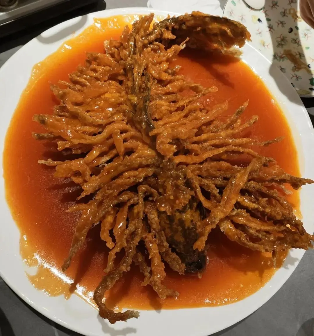 我第一次在石家庄的正定古城吃到金毛狮子鱼时,筷子悬在半空,迟迟不敢落下。那哪是一条鱼?分明是一头刚从水里跃出的金狮,鬃毛根根倒竖,威风凛凛地蹲在青花大盘里。服务员说,这道菜在石家庄的宴席上,比主婚人的致辞还重要——没有狮子鱼,就不算正经请客。我夹起一筷子"狮鬃",酥脆的声响像是踩碎了秋天的落叶。糖醋汁裹着鱼肉入口,外层的酥壳在舌尖化开,里头的鱼肉却嫩得像豆腐。那一刻我突然懂了:为什么石家庄人说起这道菜,眼里会泛起光。从袁师傅的灶台到冬奥会的餐桌