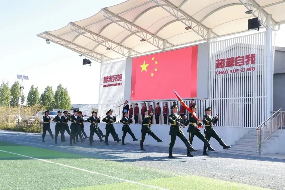 国旗护卫队迈着铿锵有力的步伐护送国旗入场