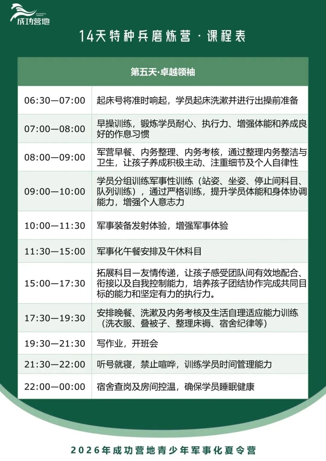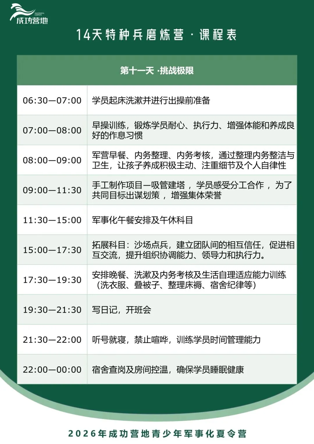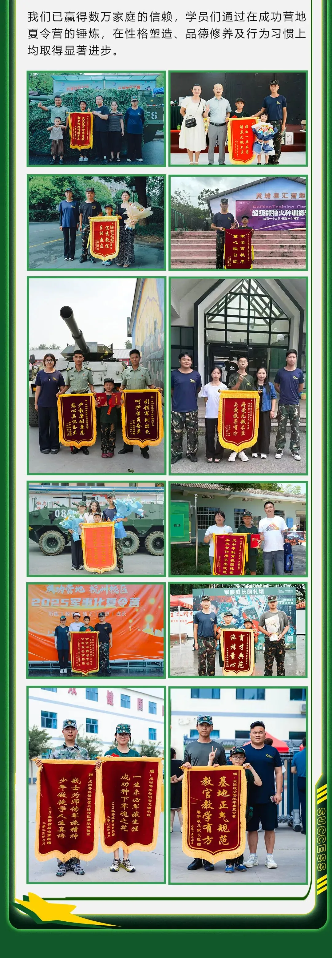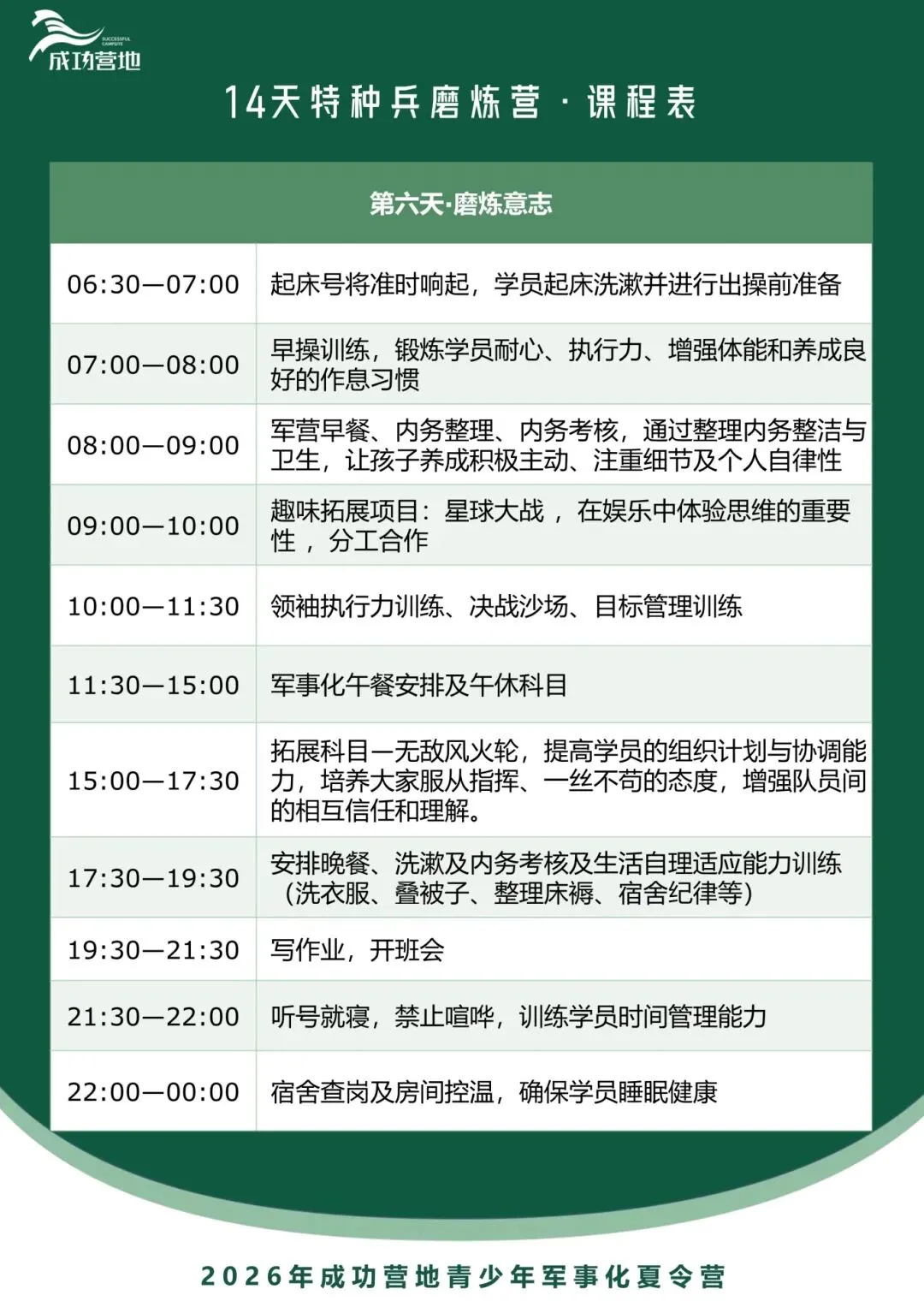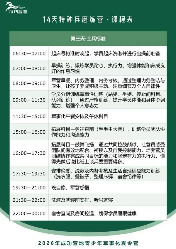 成功营地军事化特训营,是以军事训练为特色主题的青少年冬/夏令营,凭借多年的专业实践经验,融入丰富前沿的军事化课程体验,以培养孩子良好的行为习惯为切入点,让孩子体验军营生活,学习军人优良生活作风,锤炼孩子自觉、自律、自立、自强的优秀品格,增强行为责任感,以科学引导和心理干预帮助孩子完成五大核心修炼,搭建青少年全面成长、卓越发展的领袖思维体系。