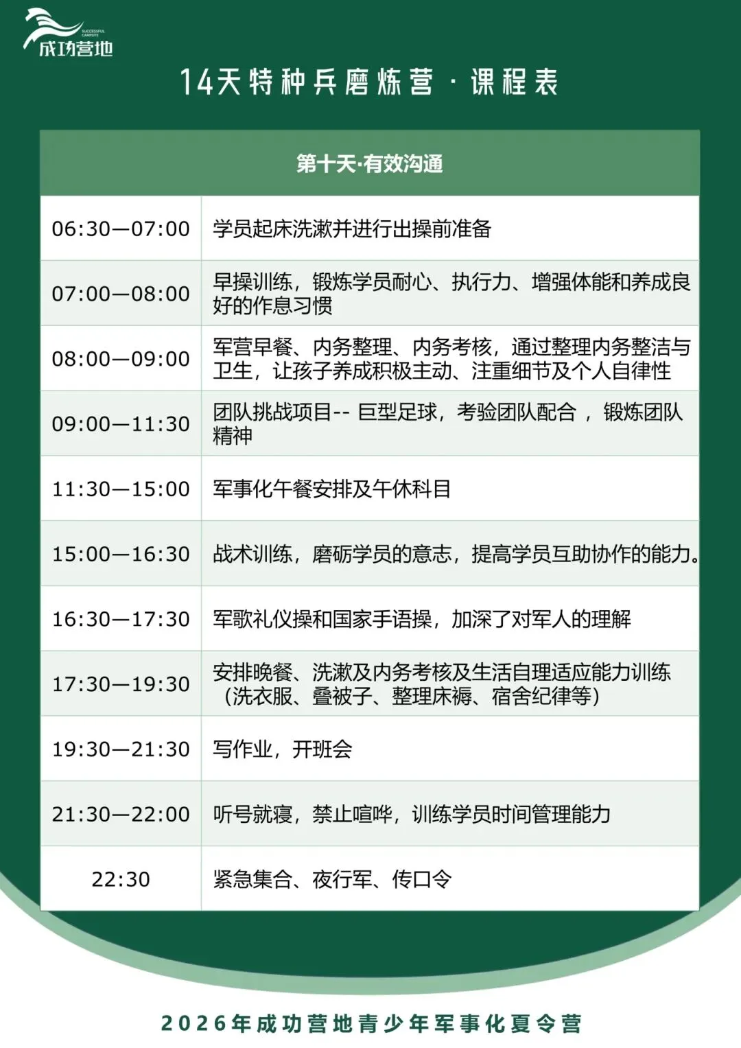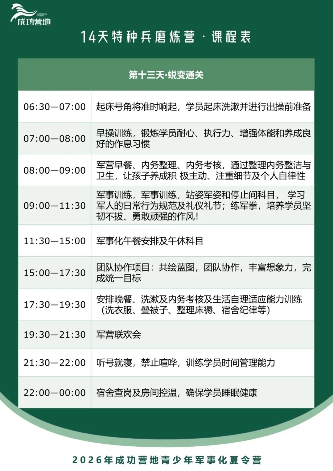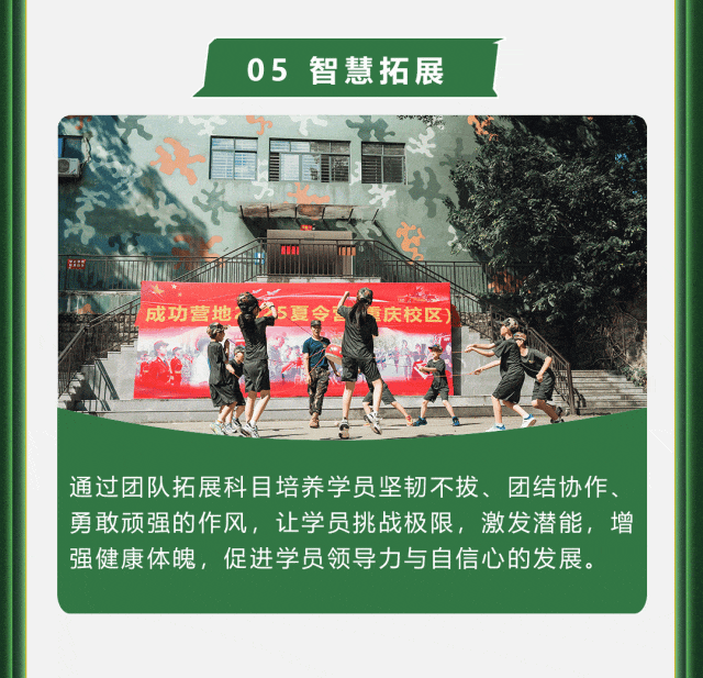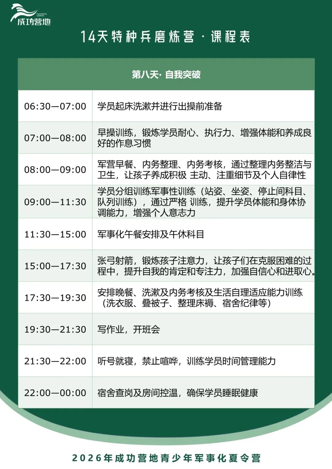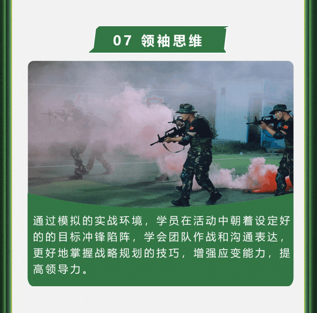 成功营地军事化特训营,是以军事训练为特色主题的青少年冬/夏令营,凭借多年的专业实践经验,融入丰富前沿的军事化课程体验,以培养孩子良好的行为习惯为切入点,让孩子体验军营生活,学习军人优良生活作风,锤炼孩子自觉、自律、自立、自强的优秀品格,增强行为责任感,以科学引导和心理干预帮助孩子完成五大核心修炼,搭建青少年全面成长、卓越发展的领袖思维体系。