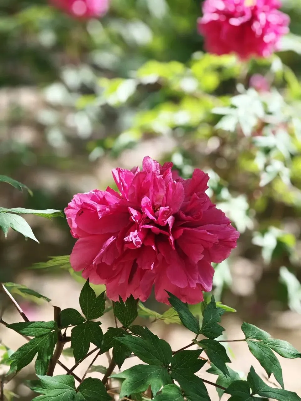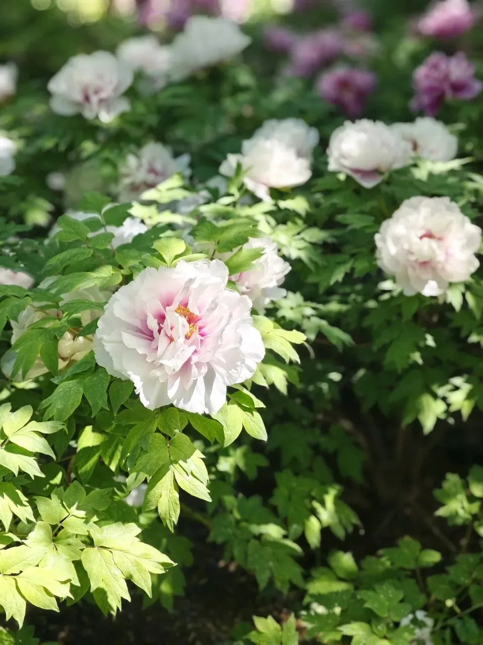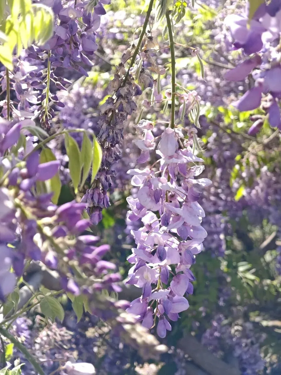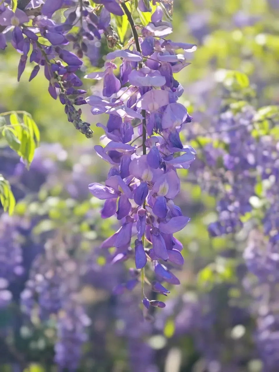 世间之事不外乎“缘分”二字,缘分到了,事儿就成了;缘分不到,总是不会圆满如意的。我来植物园是为了牡丹,准确来说是为了荷包牡丹,可是兜兜转转一大圈,并未寻得好友说的那几棵玲珑的尤物。不甘心,问了身穿制服的保安小哥儿。小哥儿盯着我看了好几秒钟,语气有点儿不满地说:“什么荷包牡丹,你说的是灯笼牡丹吧。”这直截了当的话,配上他毫不掩饰的表情,我必须给小哥儿配个画外音:“头发都白了,怎么还能说错灯笼牡丹的名字,没学问!”我想他心里肯定是这么想的,人家毕竟是植物园的保安呀,也算“专业人士”了,看不上我这如假包换的外行,有点儿职业歧视,没毛病,能接受。我一想,也对,小哥儿说的这个名字更形象,赶紧忙不迭点头称是,顺带立刻问他在哪里。小哥儿用手一指说:“牡丹园那里,不过应该看不到了,谢了。”不死心的我谢过他,执着地又去寻找。寻找未果,给好朋友打电话,她说别找了,荷包牡丹就几棵,还很矮,花儿谢了,根本找不到。好吧,看来我跟荷包牡丹,或者叫灯笼牡丹的缘分还未到。那就等等吧,有缘终会相见,无缘也不强求,随缘,就很好。你问这几张荷包牡丹照片哪来的?好朋友的,我,借鉴借鉴,给喜欢的人看看这俏模样。放过对荷包牡丹的执着,遇到了植物园里不期而遇的惊喜。我觉着我这张照片拍得特别好看,人像模式,虚实结合,阳光的透亮将那一串紫色浸染了几分灵动与鲜活。花卉园的紫藤已经不见了花儿的影子,长安公园的紫藤也已经褪去了最华贵的郁郁深紫,显得苍白柔弱。