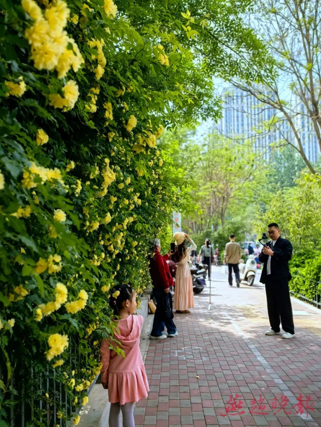 从早到晚,花墙前人流不断。清晨,有摄影师专程蹲守第一缕晨光,捕捉花朵在朝阳下的通透质感;傍晚,情侣们牵手而来,在花瀑下合影留念;还有不少家长带着孩子、老人结伴前来,在花墙前驻足观赏、拍照留念。手机、相机、自拍杆……各式拍摄设备齐上阵,人们用镜头记录下这一年一度的“4月限定美景”。