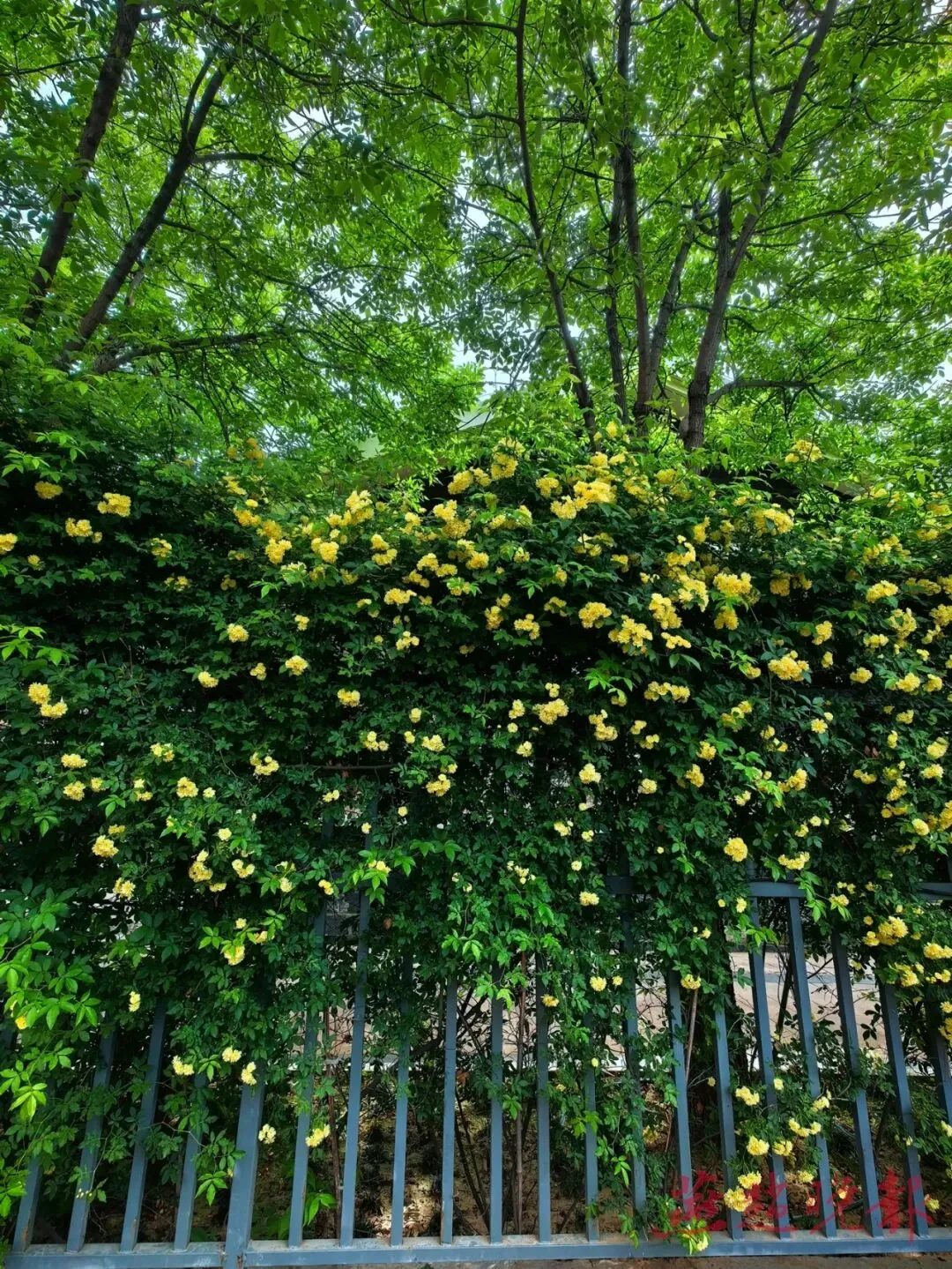 这面木香花墙位于体育公园街与祥泰路交叉口的东南角。昨天,记者在现场看到,一面数十米长的栅栏上,木香花层层叠叠、竞相绽放。藤蔓缠绕、绿叶点缀,蜜黄色花朵如瀑布般从栅栏垂落,花团锦簇,蔚为壮观。微风吹过,空气中弥漫着清雅的花香,令人流连忘返。