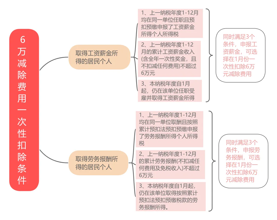 如果上一整年(1-12月)都在当前这家公司,并且上一年的全部工资、奖金加起来没超过6万元,今年继续在这家公司工作,那么今年年初就可能被系统默认为一次性享受6万元的减除额度。