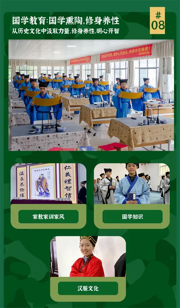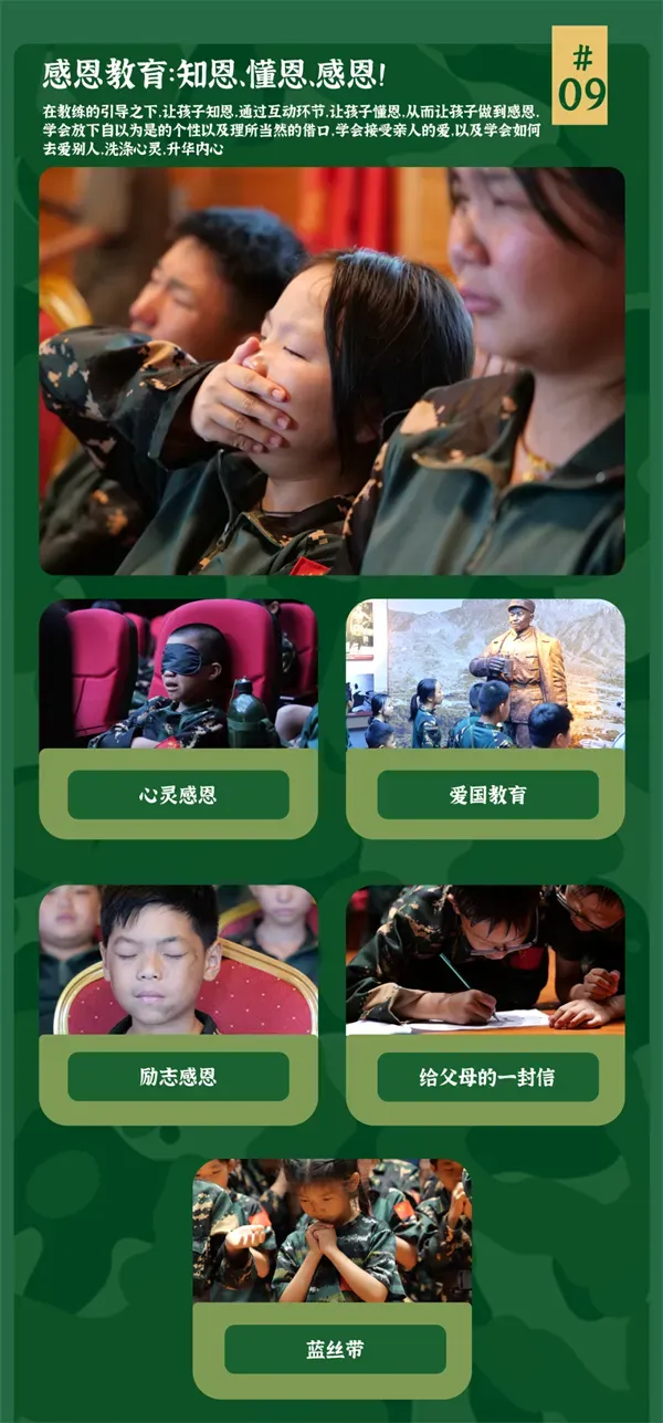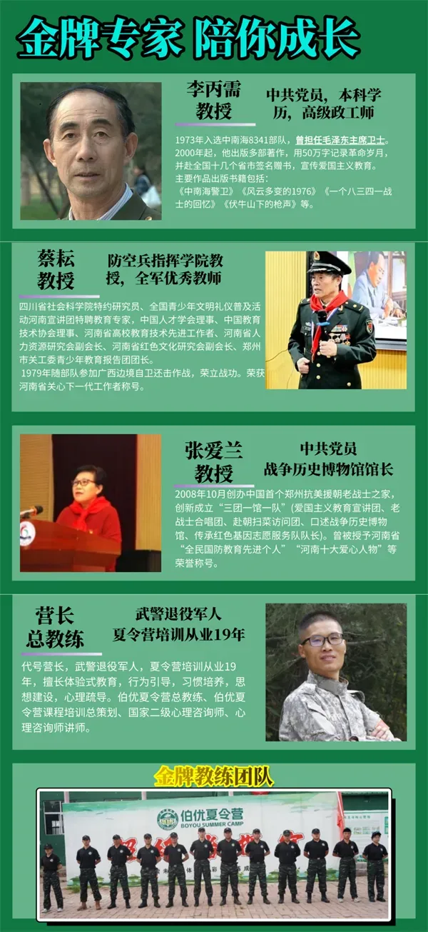 师资配比:10:1--10 人为一个班,每班配备一名主训教官、一名辅助教官,辅助教官 24 小时陪护。