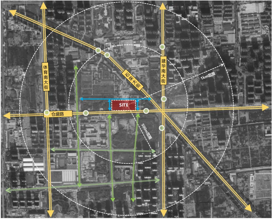方案设计的回应:发挥项目用地四面临路的场地优势,沿昌博街、仓盛路、福慧路设置客流出入口,沿东侧赵卜街设置货流出入口,实现客货分流。利用停车场用地作为超市的主要出入口和广场疏散空间,向东布置超市建筑主体和卸货场地,为海绵设施留出空间。