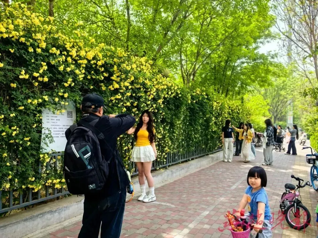 4月,石家庄市体育公园的木香花迎来盛花期,密密匝匝的蜜黄色小花沿墙如瀑倾泻而下,香气袭人,吸引了大批市民前来拍照打卡,成为社交媒体上热议的“网红花墙”。