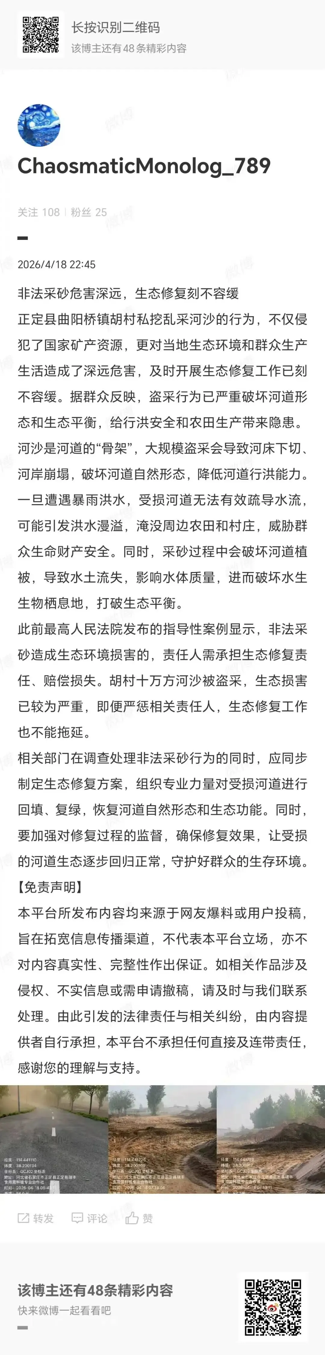 在此郑重追问:该区域是否存在合法采砂审批手续?非法私挖乱采河沙行为为何长期存在、未能及时监管制止?