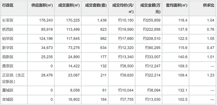 成交面积排名:长安区 > 裕华区 > 桥西区 > 新华区 > 高新区 > 正定 > 栾城区 > 鹿泉区 > 藁城区。