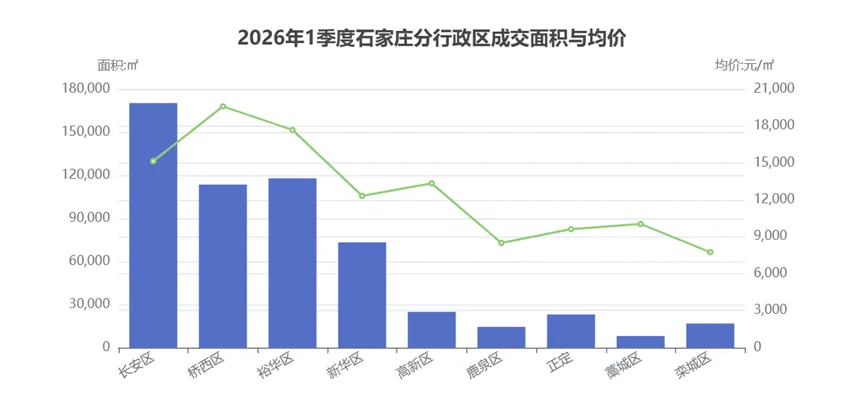 长安、桥西、裕华三大主城区合计贡献全市成交面积约64.6%、成交金额约67.9%,主城区仍是市场量价双重的核心支撑。