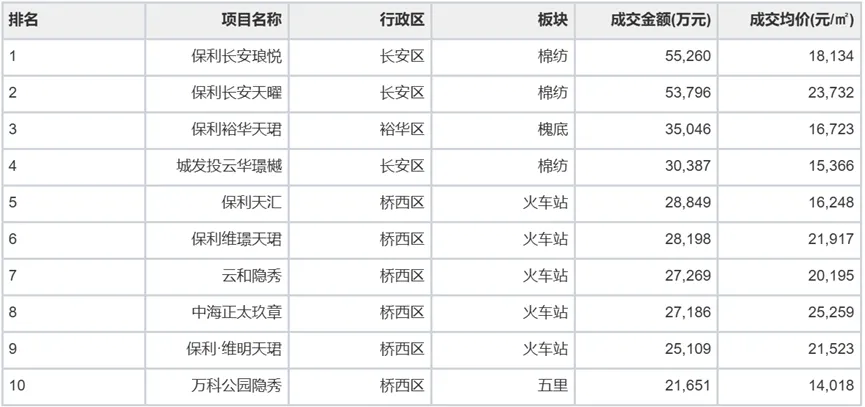 成交金额排名:长安区 > 桥西区 > 裕华区 > 新华区 > 高新区 > 正定 > 栾城区 > 鹿泉区 > 藁城区。