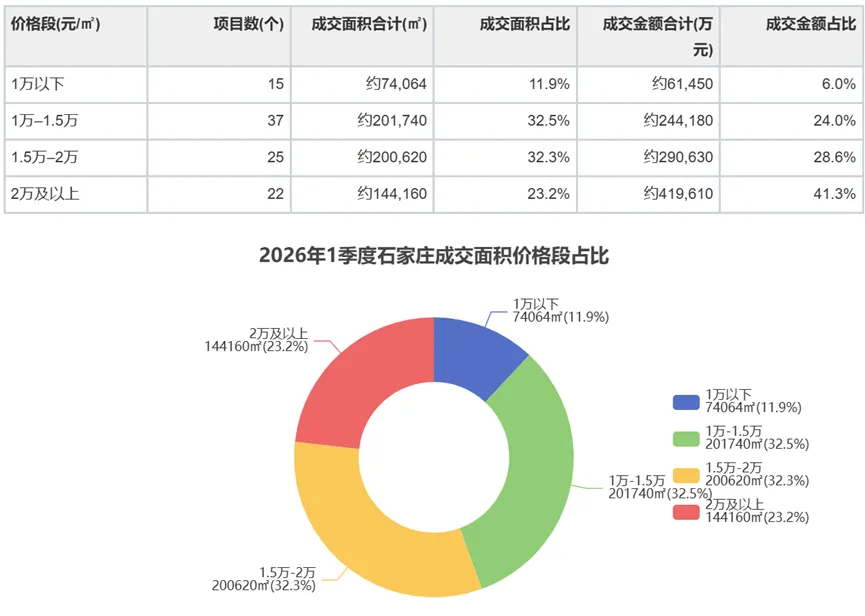2026年1季度,石家庄住宅市场在结构上呈现"核心集中、改善主导、品牌引领、分化延续"的鲜明特征。商品住宅成交面积62.15万㎡、成交金额101.64亿元的总量表现,叠加0.78的供求比,显示整体供需关系趋于平衡、存量消化节奏良好。土地市场方面,全季14宗成交地块、28.93亿元总成交金额与桥西区[2026]001地块14.3%的标志性溢价,共同勾勒出"国资托底、央企精准、核心板块稀缺溢价"的土地市场全景。